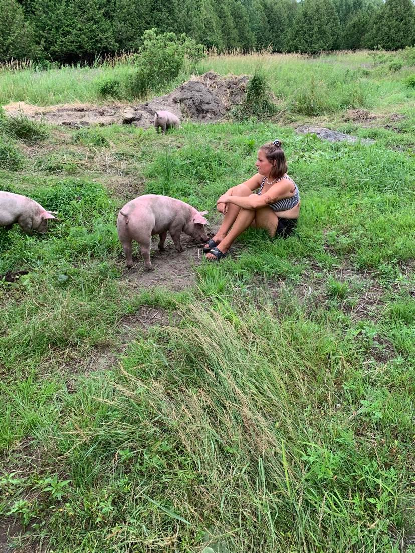 Chaque été nous accueillons une dizaine de petites cochonnettes qui se dilatent allègrement dans un acre de pacage naturel tout en s’amusant!