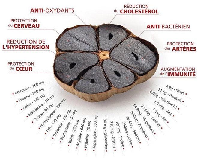 En comparaison avec l'ail blanc, l'ail noir contient 2 fois plus de molécules antioxydantes et elles sont 25 fois plus efficaces! Cette efficacité est due à une bien meilleure biodisponibilité que l'ail classique, c'est-à-dire que l'organisme l'assimile de manière presque complète, ce qui protège notre organisme des radicaux libres, ces fameux déchets responsables du vieillissement prématuré de nos cellules. Son effet antioxydant aide à renforcer le système immunitaire et à combattre les microbes et les virus.